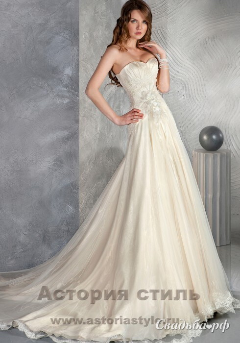 Потрясающее свадебное платье с открытой зоной декольте и кокетливым вырезом поможет вам быть на высоте в самый торжественный день вашей жизни. Модель с объёмным бантом на талии выгодно подчёркивает достоинства фигуры. Длинная юбка с изящными складками и шикарным шлейфом дополняет образ. Наряд уже в наличии в салоне Астория стиль.