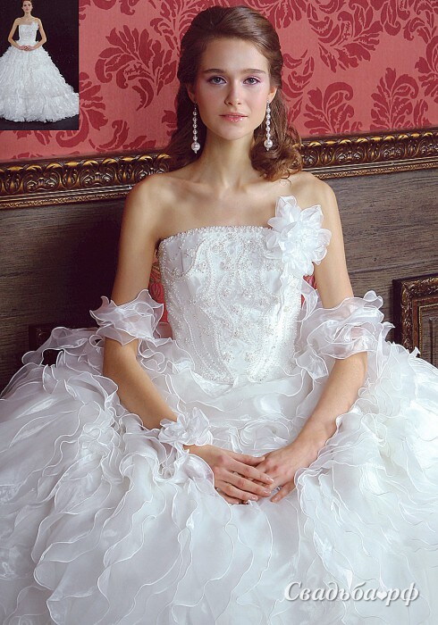 Итальянское свадебное платье, воздушное и романтичное. Жёсткий корсет расшит красивейшими узорами из бисера и украшен декоративным цветком из ткани. Юбка состоит из огромного количества горизонтальных и вертикальных оборок. Она переходит в шлейф, что делает образ ещё более сказочным и волшебным. В наличии размер 44-46, цвет белый.