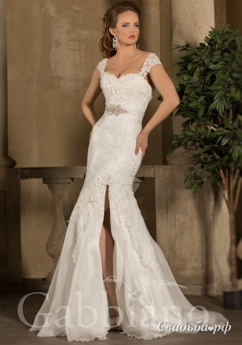 Эффектный наряд создан для роковой красавицы. Кружевной корсет с открытой зоной декольте и приспущенными плечиками зрительно увеличивает бюст. Талия украшена поясом со сверкающей вставкой. Облегающая юбка с пикантным разрезом позволит Вам продемонстрировать свои ножки. Наряд дополнен шлейфом. Это красивое свадебное платье представлено в наличии.