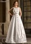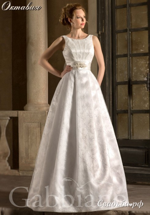 Лаконичный наряд может похвастаться оригинальной фактурой и безупречными формами. Закрытый корсет с вырезом-лодочкой на груди подчёркивает бюст. Талия украшена широким поясом со сверкающей вышивкой. Пышная юбка со складками придаёт образу королевский лоск. Это красивое свадебное платье представлено в наличии.