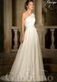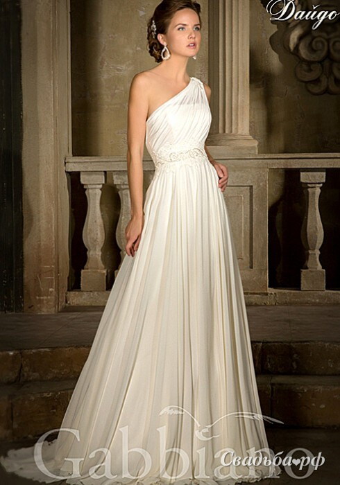 Роскошное платье в греческом стиле может похвастаться минимализмом декора и безупречностью форм. Единственная бретель и тончайшая драпировка придают образу неповторимый шарм. Талия подчёркнута изящным пояском. Длинная юбка свободного покроя струится до самого пола и переходит в шлейф. В наличии представлены размеры 42, 44, 46.