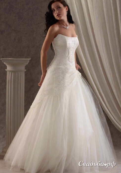 Сногсшибательное свадебное платье с открытой зоной декольте и оригинальным верхним краем корсета никого не оставит равнодушным. Верх наряда украшен тонкой вышивкой. Пышная юбка из полупрозрачной ткани доходит до самого пола и придаёт образу торжественность и королевский шарм. Последний экземпляр, цена со скидкой - 14000 рублей.