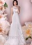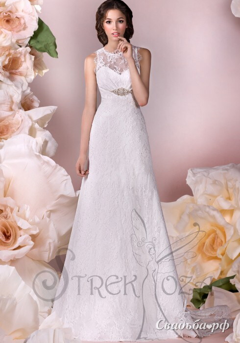 Элегантное свадебное платье приглянётся настоящей леди! Кружевная вставка на груди и сверкающая брошь под ней привлекают внимание к бюсту. На спине кокетливый вырез. Длинная юбка облегает бёдра и постепенно расширяется к полу. Ажурный шлейф придаёт образу романтичность и королевский шик.