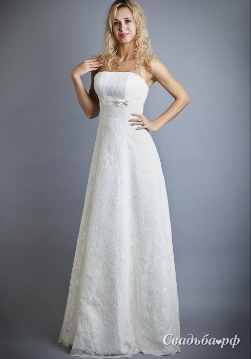 Элегантное свадебное платье Ксанти. Открытый лиф украшен лёгкой драпировкой. Под грудью проходит кокетливый поясок из атласной ленточки с очаровательным бантиком. По всей длине модель задекорирована тончайшим кружевным полотном с изумительно красивыми цветочными узорами. Юбка – длинная, расширенная книзу. Остался размер 44, новая цена 15.000 руб.