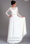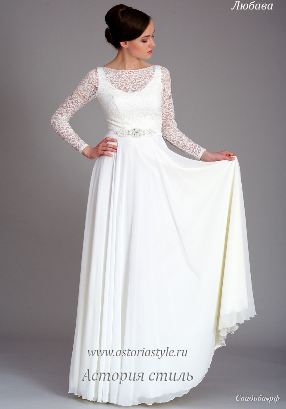 Кружевное свадебное платье с длинными рукавами. Ажурные кружевные узоры особенно эффектно смотрятся на фоне нежной кожи рук и зоны декольте. Корсет с мягким округлым вырезом также обтянут кружевной тканью. Линия талии выделена широким поясом, расшитым сверкающими декоративными камнями и стразами. Струящаяся юбка плавно ниспадает на пол.