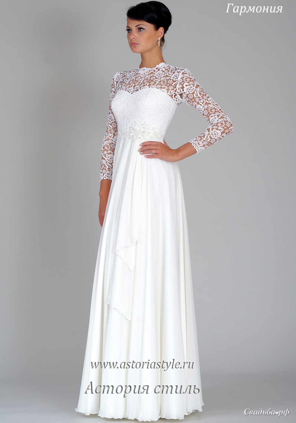 Свадебное платье с красивым кружевным верхом и легкой струящейся юбкой. Нежные цветочные узоры кружева особенно изысканно смотрятся на фоне кожи рук и зоны декольте. Строгий корсет, задекорированный кружевом, соблазнительно обтягивает фигуру. Юбка с асимметричными оборками мягко ниспадает на пол. Расшитый пояс эффектно выделяет линию талии.