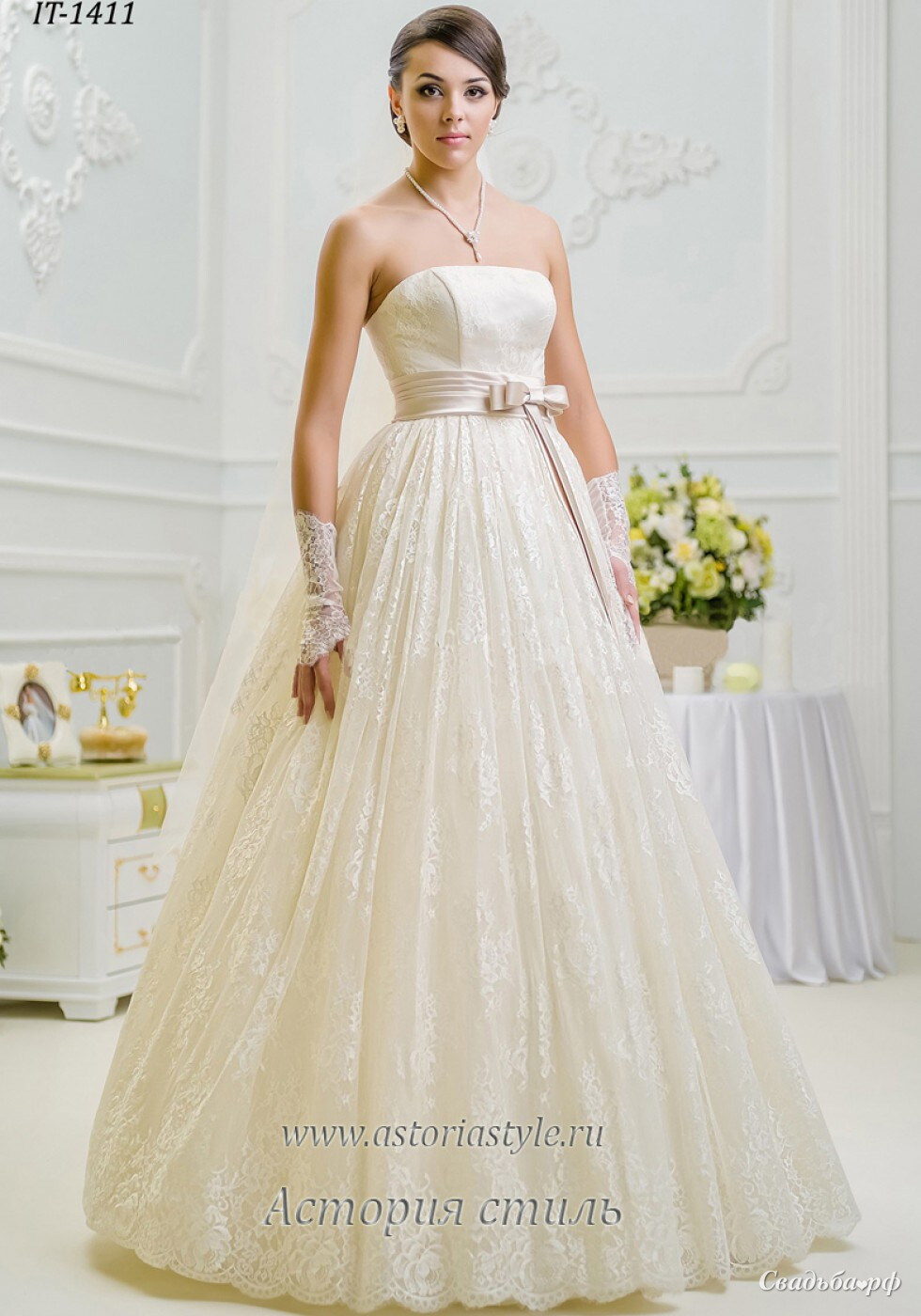 Кружевное свадебное платье, очень милое и нежное. По всей длине модель задекорирована тончайшим кружевом приятного кремового цвета. Прямой открытый лиф выглядит элегантно и соблазнительно одновременно. Линия талии эффектно выделена широким атласным поясом с роскошным бантом. Длинная пышная юбка делает образ по-королевски великолепным.