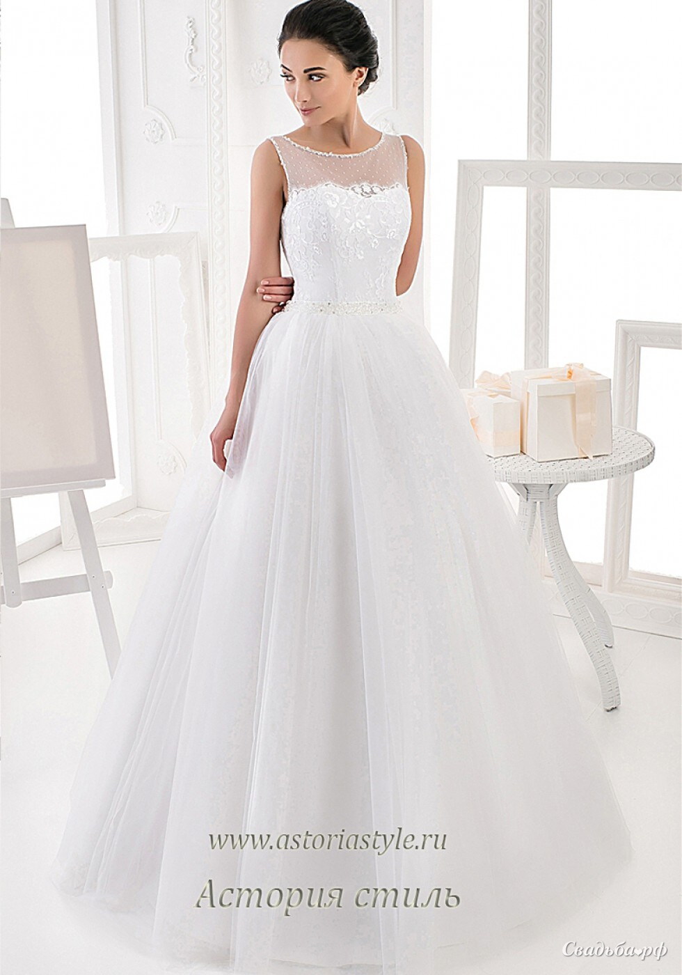 Очаровательное свадебное платье. Зона декольте кокетливо прикрыта полупрозрачной сетчатой тканью в мелкий горошек. Этой же тканью, но уже с нежными вышитыми узорами, обтянут открытый фигурный лиф модели. Линия талии выделена широким, расшитым сверкающими стразами поясом. Пышная юбка идеально дополняет этот сказочный образ.