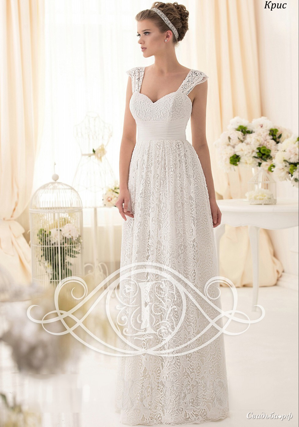 Легкое свадебное платье из кружева с плечиками. По всей длине модель обтянута ажурной кружевной тканью с изумительно красивыми цветочными узорами. Особенно эффектно эти узоры смотрятся на фоне нежной кожи плеч. Линия талии выделена широким атласным поясом. Длинная юбка мягкими складами струится вдоль фигуры и ниспадает на пол.