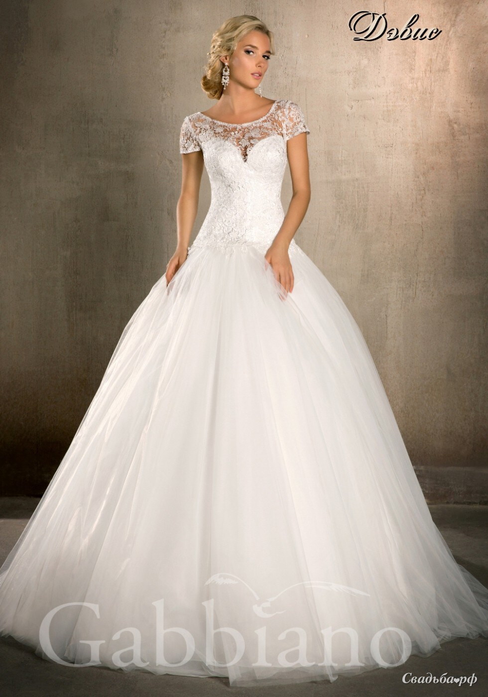 Восхитительное свадебное платье из коллекции 2014 года поможет Вам создать королевский образ. Вырез-лодочка на груди обрамлён тончайшим кружевом. Из такого же материала выполнены короткие рукавчики. Чуть заниженный корсет подчёркивает изгибы фигуры. Пышная юбка придаёт наряду торжественность. Вы будете неотразимы!