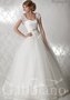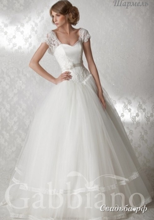 Свадебное платье наполнено нежностью и романтизмом. Атласный лиф украшен легкими кружевами, образующими широкие лямки-рукавчики. Талию подчеркивает тонкая ленточка. Пышная юбка сшита из фатина, по краю отделана кружевной каймой, делающей весь образ более привлекательным и неотразимым. Очень подойдет невесте с утонченным вкусом.