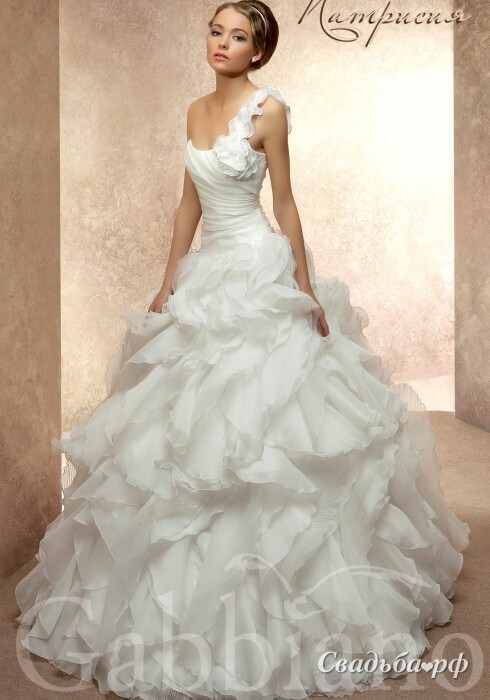 Романтичное свадебное платье с открытой зоной декольте и единственной бретелью, декорированной лёгкими воланами, создано для самых милых и женственных невест. Изящный корсет с нежной драпировкой выгодно подчёркивает достоинства фигуры. Пышная юбка с многоярусными воланами и оборками доходит до самого пола. Размеры в наличии 42, 44, 46.