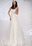 Свадебное платье А-силуэта с завышенной линией талии и тонкими бретельками украсит фигуру любой невесты. Лиф расшит кружевом и украшен тонким пояском. Юбка свободными складками ниспадает до пола, придавая образу эффект текучести и динамичности. Такой покрой не стеснит движения и скроет недостатки фигуры.