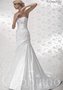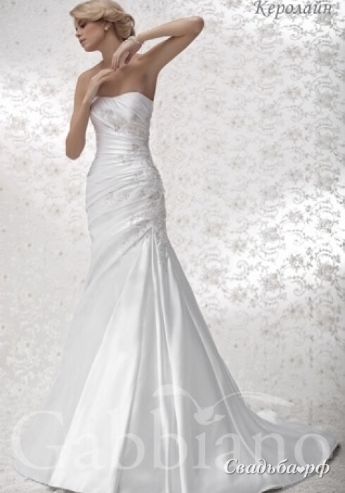 Кремовое свадебное платье с открытой зоной декольте и заниженным корсетом. Облегающая модель с изящной драпировкой выгодно подчёркивает достоинства фигуры своей счастливой обладательницы. От середины бедра платье расширяется и постепенно переходит в длинный шлейф. Элегантные складки придают образу неповторимый шарм.