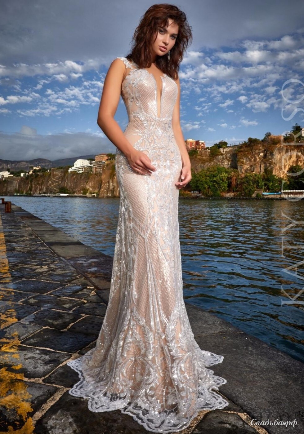 Потрясающее свадебное платье силуэта "рыбка". Модель полностью расшита эффектными пайетками. В зоне декольте глубокий вырез. Юбка с красивым шлейфом.