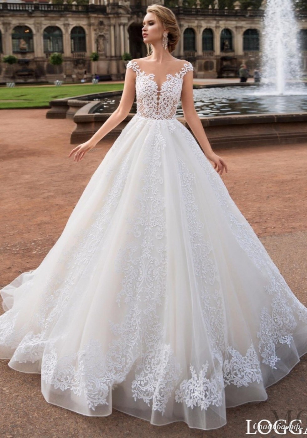Пышное королевское платье от бренда Allegresse. Кружевной лиф, расшит стеклярусом и пайетками, юбка из струящегося фатина с кружевными аппликациями, платье не утяжелено жестким корсетом.