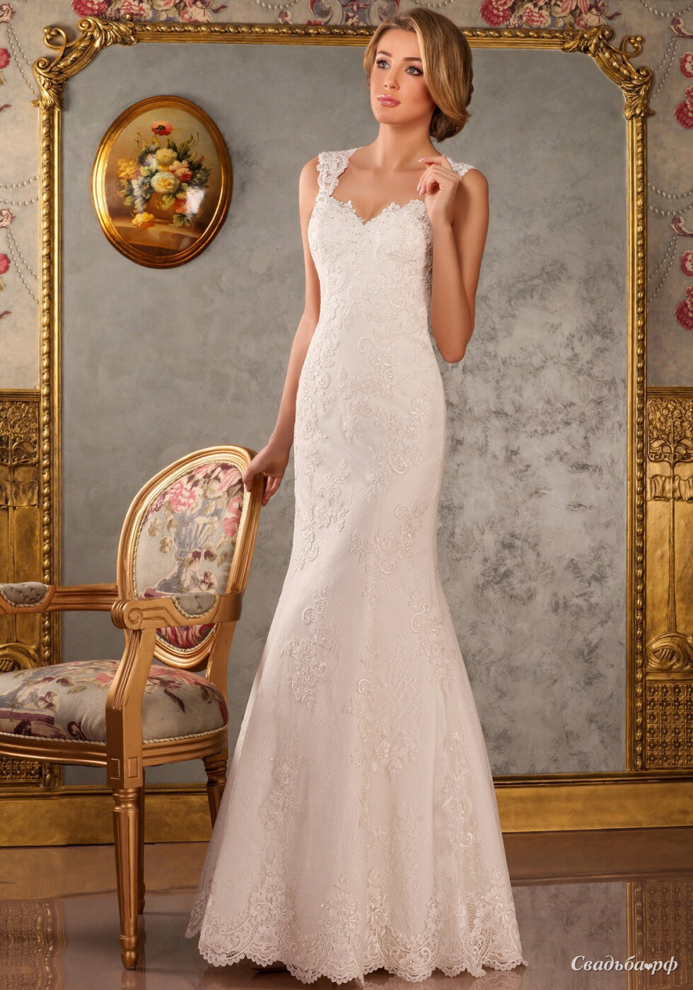 Кружевное платье силуэта рыбка от известного свадебного бренда Vendi. Верх платья имеет строгую силуэтную линию и плотно облегает фигуру невесты до уровня бедер.