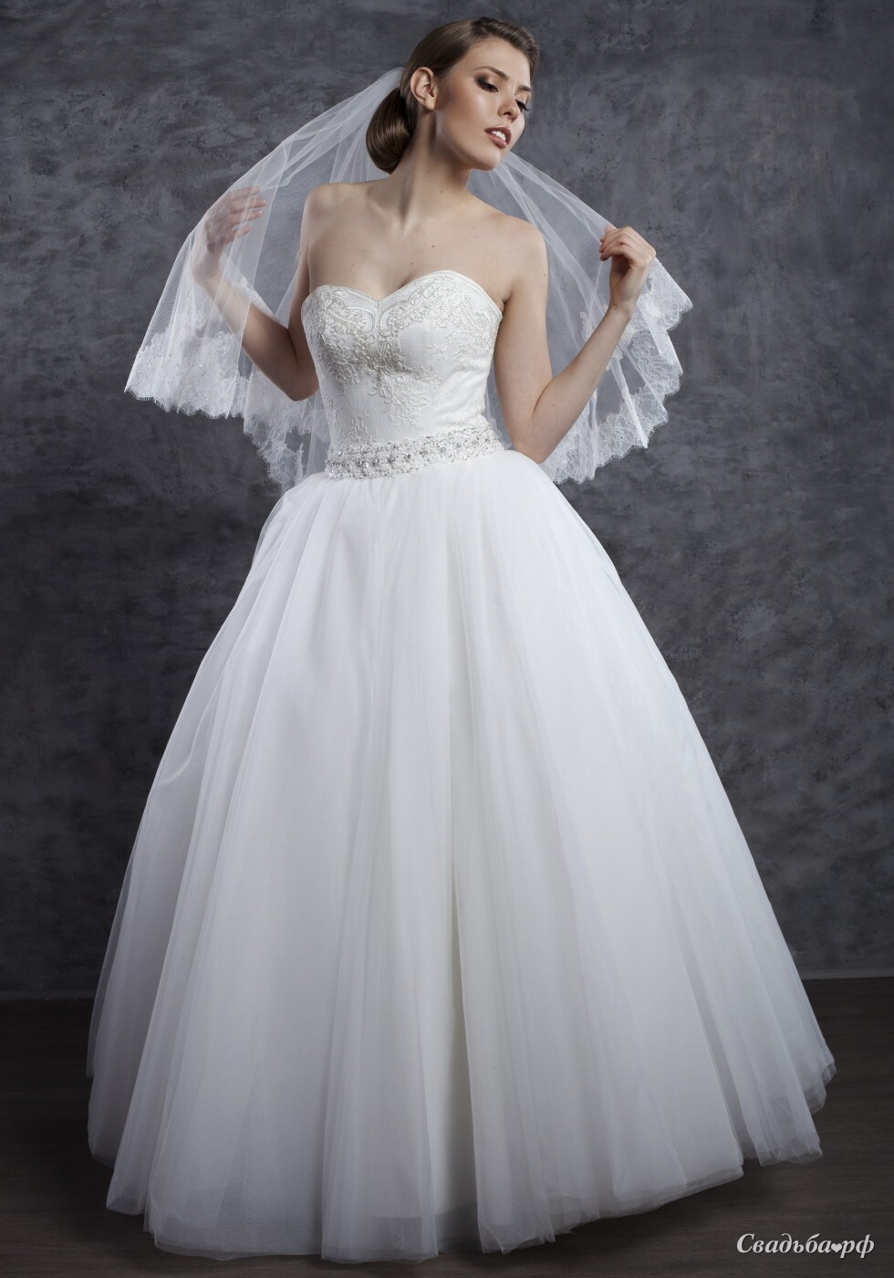 Свадебное платье с расшитым корсетом и пышной юбкой. Корсет с глубоким вырезом и открытой спиной украшен бисером. Линия талии эффектно выделена декоративным вышитым поясом из стразов и бусин. Прекрасное платье для счастливой невесты.