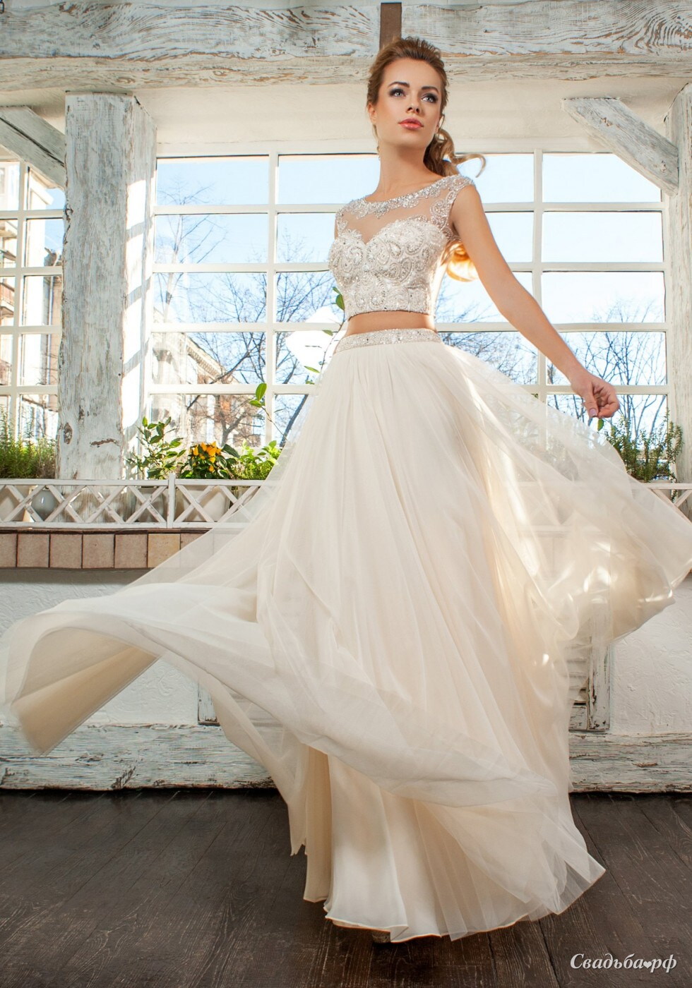 Свадебное платье представляет собой пышненькую юбочку и топ, расшитый бисером.