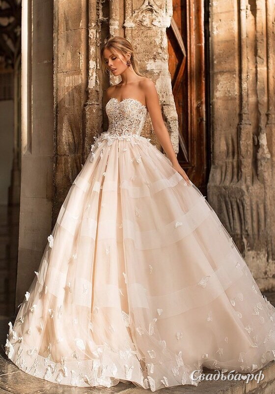 Шикарное платье с открытым кружевным верхом и пышной юбкой. Платье украшают милые 3D бабочки.