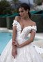 Пышное кружевное свадебное платье с приспущенными плечиками, декорированными бахромой из бисерно-жемчужных нитей и роскошным длинным шлейфом.