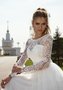 Легкое закрытое свадебное платье с кружевным верхом с рукавами и пышной фатиновой юбкой.