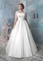 Шикарное атласное свадебное платье с бантовыми складками на юбке и ажурным кружевным верхом с короткими рукавами.