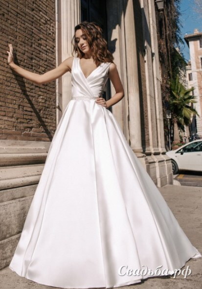 Атласное свадебное платье с пышной юбкой со шлейфом.
