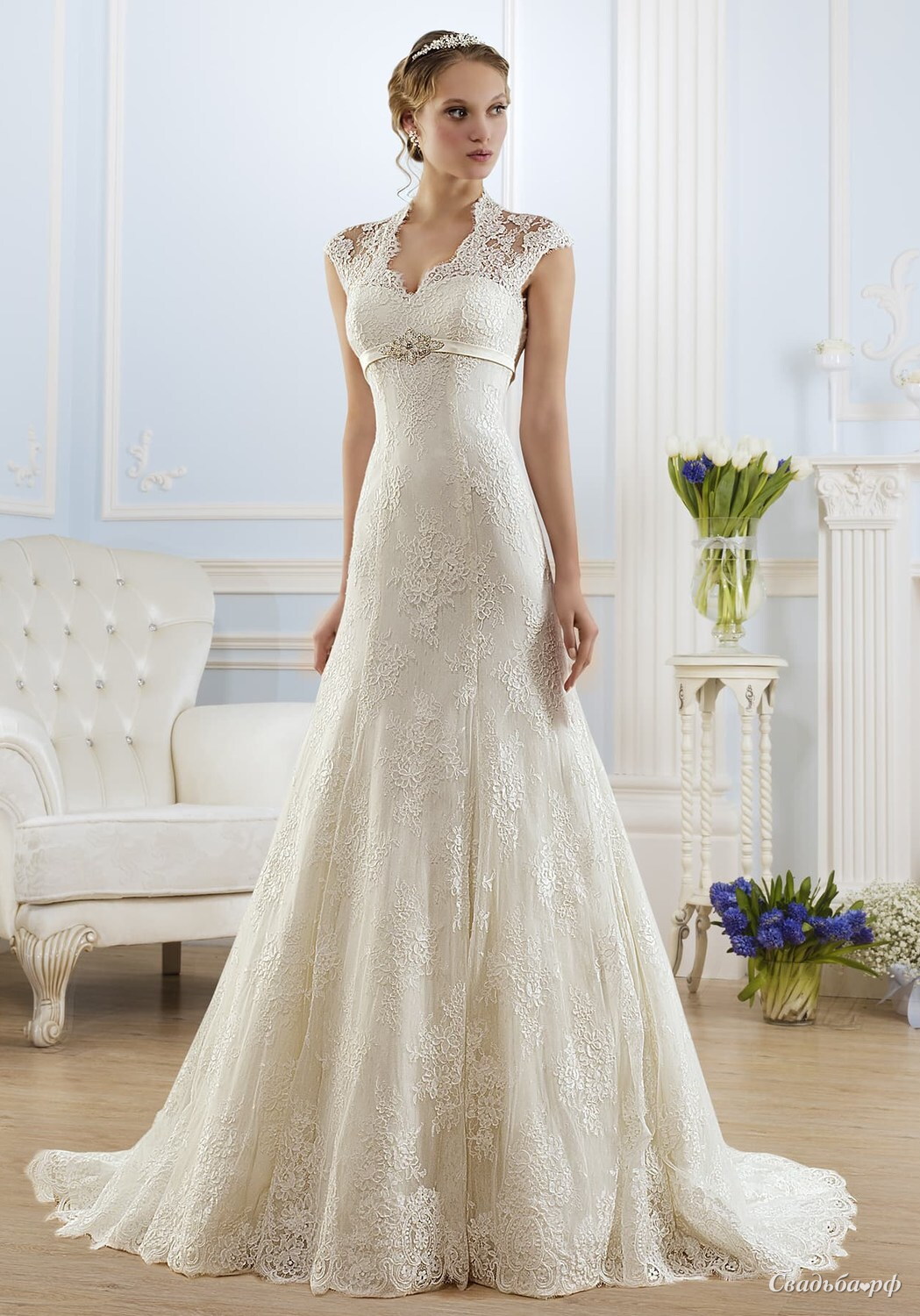Нежное кружевное свадебное платье с закрытыми плечиками и небольшим шлейфом.
