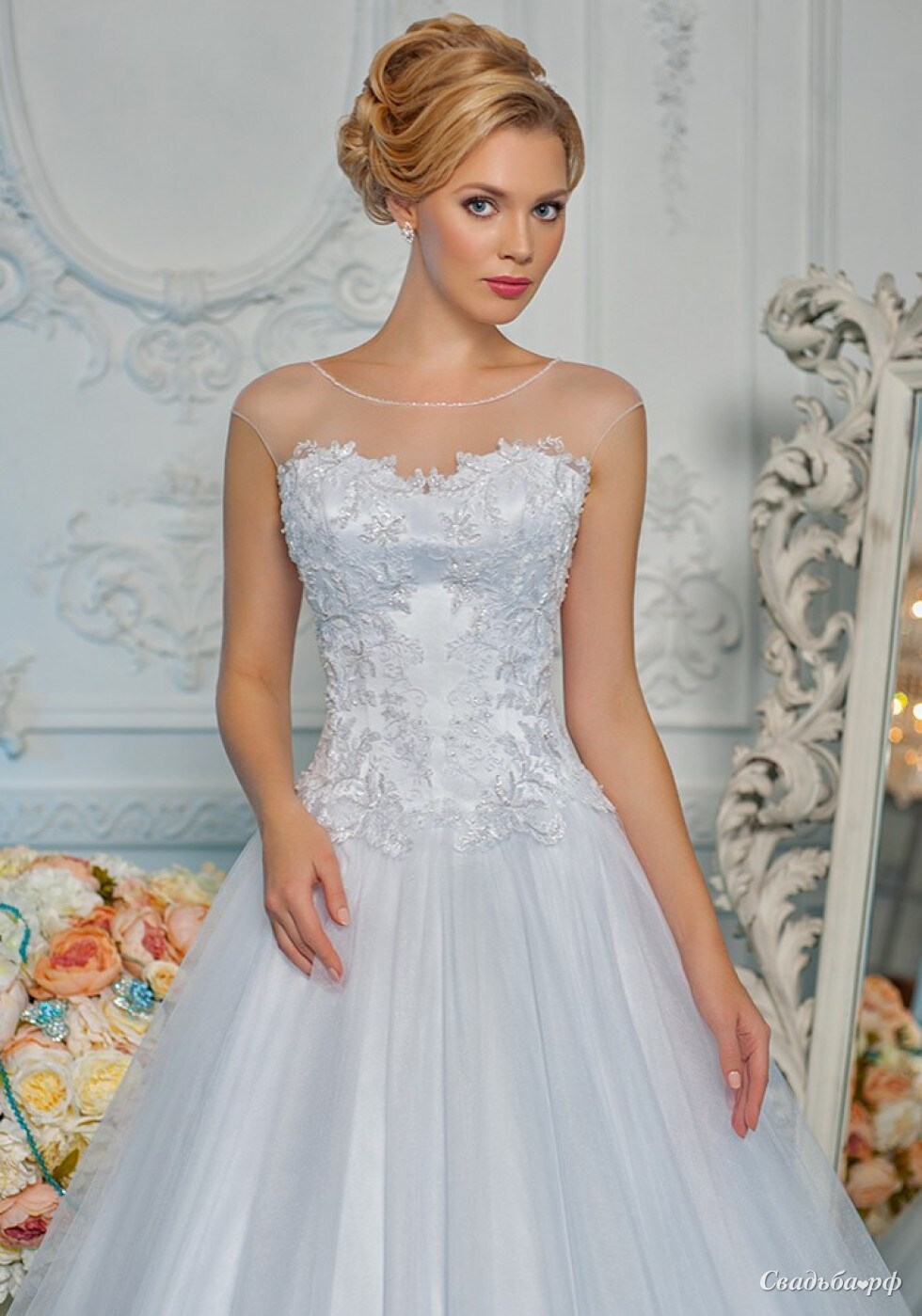 Декольтированное платье с кружевом, струистая пышная юбка.