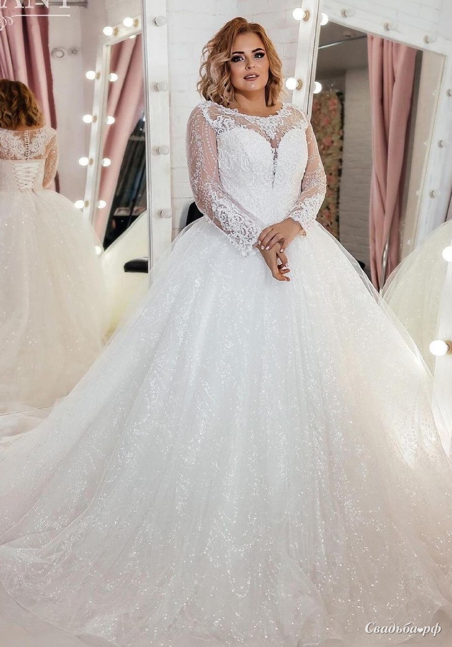 Свадебное платье с рукавом, пышное, все полностью мерцающее. Идеально для роскошной свадьбы.
