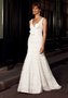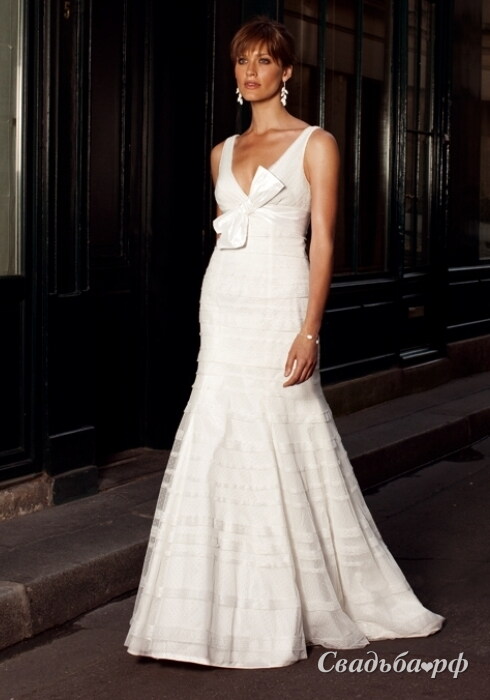 Свадебное платье на бретелях, с глубоким V-образным декольте. Лиф декорирован бантом. Облегающая бедра юбка покрыта кружевным полотном. Это привносит в образ невесты особую дороговизну и шарм. Отлично будет смотреться на невесте среднего или высокого роста, скромных форм. Дополнит Ваш образ диадема или колье.