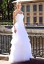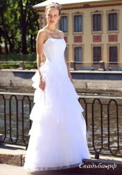 Элегантное свадебное платье с открытым верхом. Подчёркнутая линия талии делает это платье желанным выбором для невесты с хорошей фигурой. Длинная юбка из шифона с несколькими ярусами оборок смотрится очень романтично. Такое платье будет гармонично сочетаться с изысканным колье на шее. Подойдет такой наряд хрупкой и юной невесте.