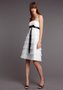 Нестандартного дизайна эффектное свадебное платье из шёлка для ярких и смелых натур. Открытые плечи и руки, умеренное декольте придают модели игривость. Необычная пятиярусная юбка длиной чуть выше колена открывает великолепные ножки. Черная шёлковая лента с бантом под грудью стильно подчёркивает бюст.