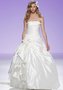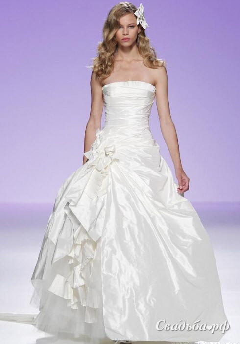 Шикарное свадебное платье из тафты с открытыми руками и плечами. Заниженная линия талии. Корсет драпирован складками тафты, линия декольте прямая. Юбка на правом бедре собрана в интересную композицию из тканевых цветов. Нижняя пышная фатиновая юбка слегка виднеется из под верхнего слоя тафты, это добавляет наряду легкости и воздушности.