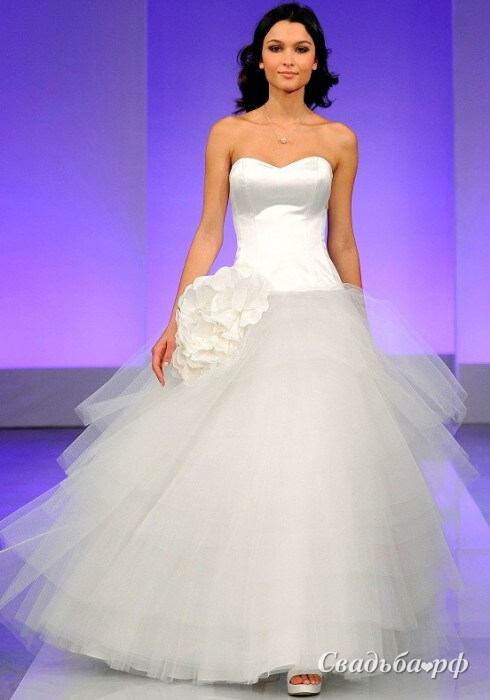 Эффектное платье от именитых французских дизайнеров поможет создать невесомый образ современной невесты. Гладкий корсет с открытой зоной декольте гармонично сочетается с легкой юбкой из воздушного фатина. Крупный цветок оригинальной формы расположился на бедре. В таком платье Вы будете парить над землёй. Наряд подчёркивает достоинства фигуры.