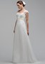 Легкое свадебное платье из нежного муслина предлагается в белом и кремовом цветах. Верх платья декорирован дорогим кружевным шитьем, которое плавно переходит в широкие бретельки на плечи. Юбка от линии талии ниспадает к полу и заканчивается аккуратным шлейфом. В таком наряде образ невесты получается нежный, воздушный и очень романтичный.