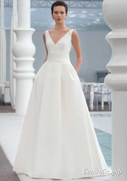 Великолепное свадебное платье А-силуэта из сатина-микадо. V-образный вырез и широкие бретели привлекают внимание к зоне декольте, на талии широкий пояс в тон платья без декоративных элементов. Юбка у талии собрана в несколько складок и ниспадает к полу и переходит в шлейф. Платье можно выполнить в белом, кремовом, голубом, красном и черном цветах.