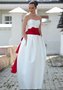 Невероятное и даже вызывающее свадебное платье А-силуэта из сатина-микадо. Плотный корсет и слегка пышная юбка с кармашками - все очень просто как кажется на первый взгляд, но испанской страсти этому наряду придает широкий ярко-красный пояс с объемными декоративными цветами. Пояс завязывается сзади в большой бант и ниспадает на 2/3 длины юбки.