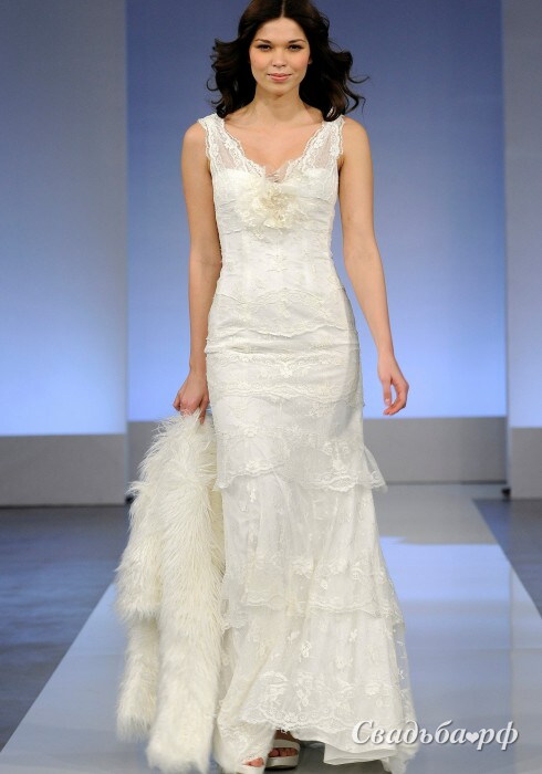 Элегантное свадебное платье классического прямого силуэта. V-образный вырез, симметричные широкие бретели, придающие наряду практичность, на груди легкий декоративный элемент в флористическом стиле. Идеально подчеркнута линия талии и бедер. Многослойная юбка, выполненная из тонкого изысканного кружева ручной работы, имеет ярусную структуру.