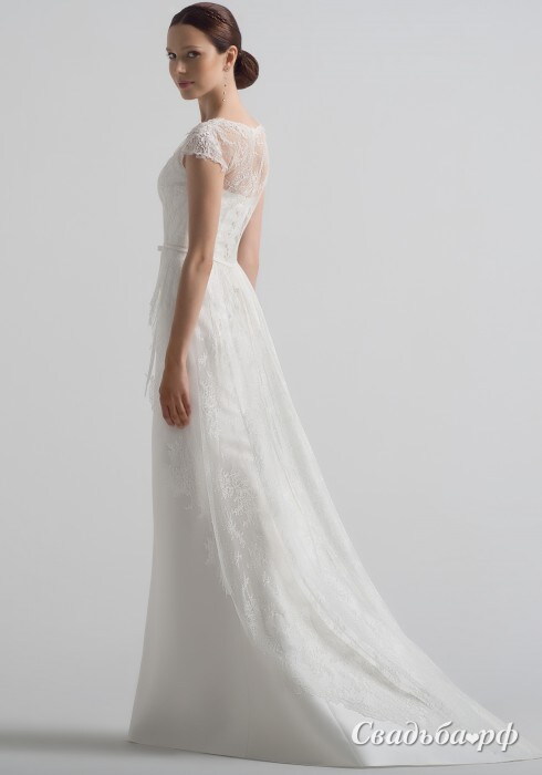 Свадебное платье прямого силуэта с кружевной накидкой не оставит равнодушными самых романтичных и нежных натур. Полупрозрачная вставка на спинке и миниатюрные рукавчики придают образу невинность. Талия подчёркнута тонким поясом. Длинная юбка струится до пола и постепенно переходит в шлейф. Изысканный наряд без лишнего декора.
