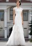 Изысканное свадебное платье прямого силуэта создано для настоящей леди. Наряд выполнен из роскошного кружева. Закрытая зона декольте и миниатюрные рукава придают образу невинность. Модель подчёркивает осиную талию своей обладательницы. Длинная юбка из нескольких ажурных ярусов облегает бёдра и постепенно расширяется к полу.