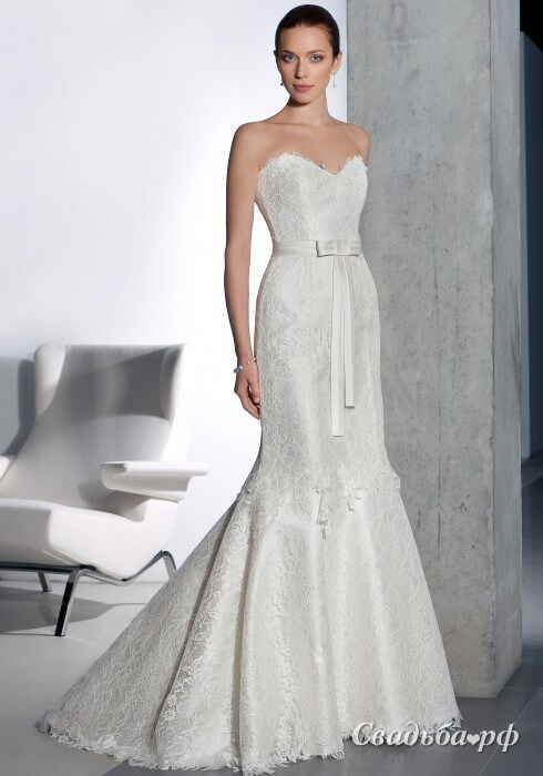Кружевной наряд изысканного силуэта Русалочка идеально сядет по фигуре и подчеркнёт женственные изгибы Вашего тела. Корсет с открытой зоной декольте дополнен изящным поясом с кокетливым бантом. От уровня колен облегающая юбка начинает расширяться и постепенно переходит в шлейф. Свадебное платье может похвастаться необычной фактурой.