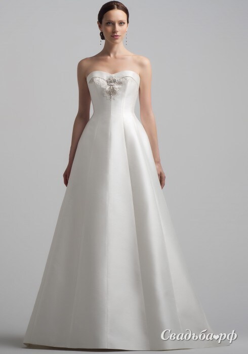 Эффектное свадебное платье А-силуэта выполнено из микадо. Наряд может похвастаться идеальной посадкой, комфортом и сногсшибательными формами. Миниатюрный корсет с открытой зоной декольте и отворотом по верхнему краю дополнен цветочной вышивкой под грудью. Пышная юбка со шлейфом расширяется к полу. Наряд отличается минимализмом и элегантностью.