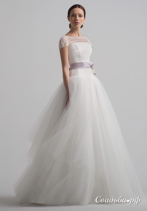 Пышное свадебное платье с фатиновой юбкой. Удлинённый корсет с прямым лифом полностью обтянут полупрозрачной тканью в горизонтальную полоску. Эта ткань плавно переходит на зону декольте и формирует вырез-лодочку и совсем короткий рукавчик. Линия талии выделена широким атласным поясом с оригинальной цветочной композицией контрастного цвета.