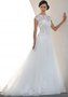 Пышное свадебное платье с прозрачным кружевным корсетом. Вертикальные полосы лифа визуально стройнят и удлиняют силуэт. Нежное кружево особенно эффектно смотрится на фоне зоны декольте и плеч. Вырез лодочка идеально сочетается с неглубокой проймой рукавчиков. Пышная лёгкая юбка по нижнему краю украшена кружевным цветочным орнаментом.