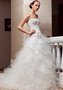 Пышное свадебное платье с изящным удлинённым кружевным корсетом. Композиция из объёмных вышитых цветов украшает корсет по диагонали и завершается большим цветком, скомбинированным из полупрозрачной ткани и кружева. Отдельные вышитые элементы спускаются вдоль пышной юбки, состоящей из множества легчайших фатиновых оборок.