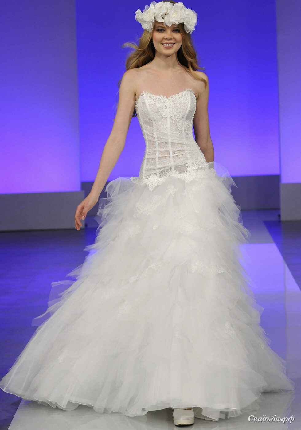 Свадебное платье от французского модного дома CYMBELINE. Декольте в виде сердечка эффектно подчёркивает изящество открытых плеч. Строгий корсет выполнен из полупрозрачного кружева с красивыми цветочными узорами и украшен мягкой драпировкой. Пышная юбка состоит из множества фатиновых лепестков, что делает её лёгкой и летящей.