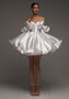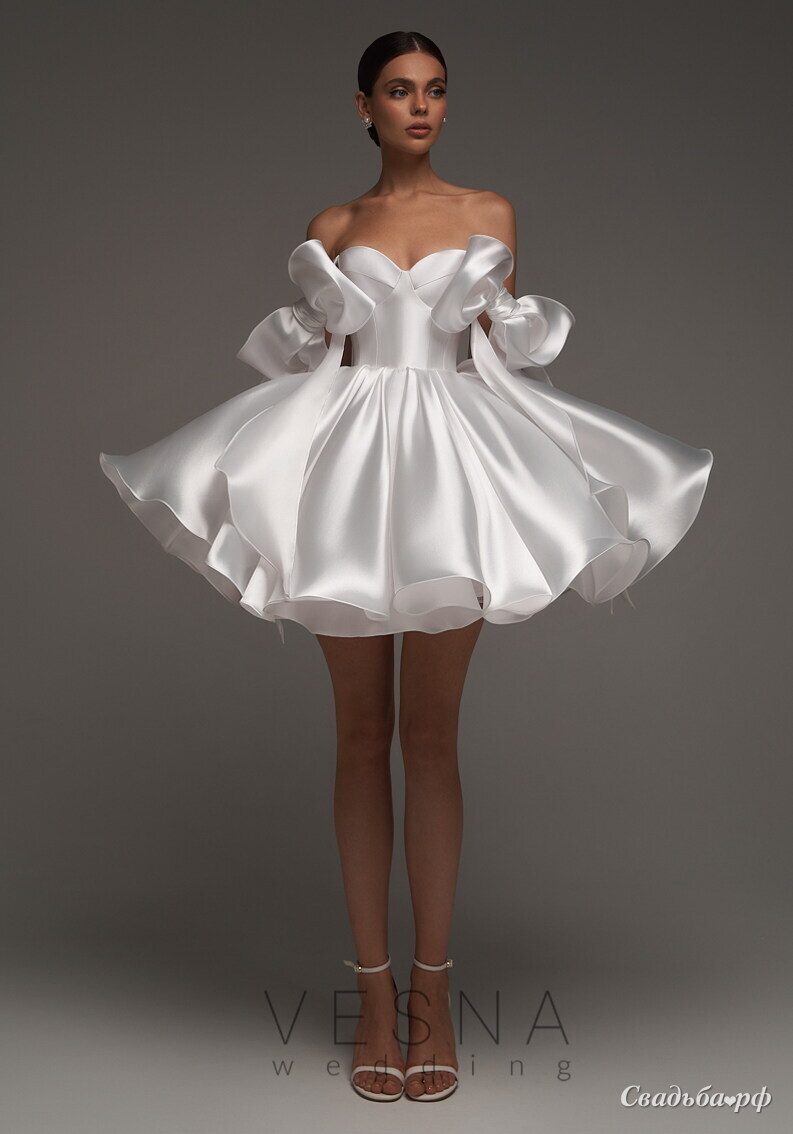 Платье с короткой пышной юбкой выполнено из гладкой атласной ткани. Атласные бретели с бантами с длинными лентами можно спустить по линии плеч, создавая эффект рукавов-фонариков.