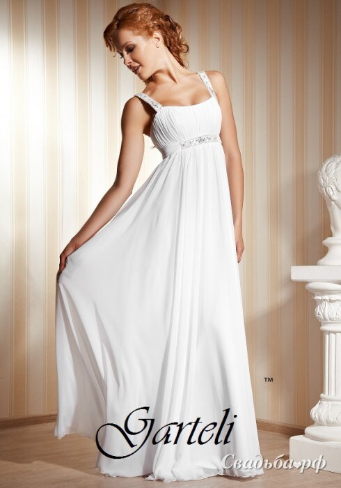 Струящееся платье от отечественного бренда Garteli не оставит равнодушной ни одну невесту. Драпированный верх наряда дополнен изящными бретелями. Поясок в ручную расшит сверкающими камнями. Длинная юбка из тонкого шифона струится до самого пола. Завышенная талия помогает зрительно вытянуть силуэт. Почувствуйте себя настоящей богиней!